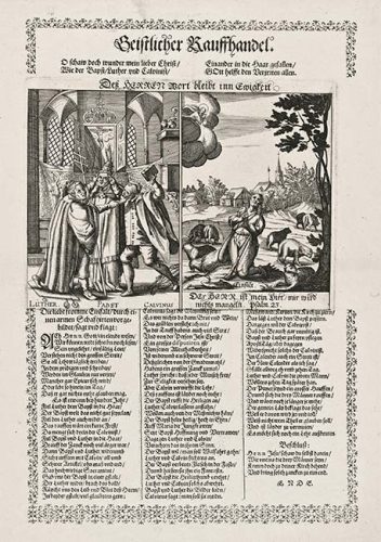 A broadsheet titled “Geistlicher Raufhandel” (“Spiritual Scuffle”) shows the Pope, Luther and Calvin as they exchange arguments of a different sort, thus capturing the tense climate