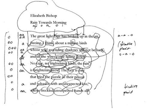 Was geschieht in dem Gedicht? Der große Lichtkäfig, oder der große lichte Käfig, oder der große leichte Käfig ist aufgebrochen in der Luft – wir sehen, denken wir, vorbereitet durch den Titel, einen Wolkenbruch, einen Regenguss. Doch schon in der zweiten Zeile werden wir unsicher. Sind a million birds, eingeleitet durch das zögernde I think, sind die Millionen Vögel eine Metapher für Regentropfen? Aber wie können dann in der nächsten Strophe ihre »wild ascending shadows« sich entfernen, ihre Schatten aufsteigen und verschwinden? Vielleicht sind also Regentropfen, andersherum, eine Metapher für Vögel? Ein Schwarm, von einem Wolkenbruch aufgeschreckt; die Schatten der Vögel, selbst ephemer wie Wolkenstrukturen, im heller werdenden Dämmern, die sich fortbewegen? Und was fällt dann in der vierten Zeile, die mit präzisem Timing einen Bruch herbeiführt: »and all the wires come falling down«? Hier wechselt das Subjekt im Satz, es ist nicht mehr der Käfig, der die ersten drei Zeilen bestimmte, sondern »all the wires« – die Drähte, die Drahtstäbe des imaginierten Käfigs, wie Regenschnüre, vielleicht. Wie etwas Großes, das zerbrach, und von dem man nicht genau sagen kann, auch beim Lesen des zweiten Teils nicht, ob sich darüber Trauer beimischt oder Erleichterung oder beides. Es wäre aber dieser Schwebezustand allein kaum der Rede wert, die hier skizzierte Lesart würde keine Ekstase auslösen, wenn nicht die sprachliche Struktur des Gedichts selbst wie ein Käfig wäre, der zugleich da ist und aufbricht, zugleich Vogel und Gitter, Schauer aus herabrinnenden Vokalen und Konsonantendraht.