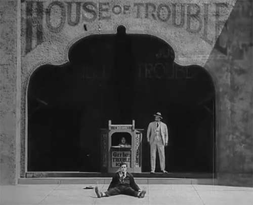 Der Film beginnt, und wir finden einen Mann in einem Raum, einer Art Gruselkabinett mit mehreren Türen. Hinter jeder Tür lauert eine neue Tücke, Skelette, Kreaturen, wabernde Nebel. Ratlos steht der Mann und starrt die rasch wieder verschlossenen Türen an, sucht einen Ausweg. Da öffnet sich jäh eine Falltür, mittels einer Rutsche wird der Ahnungslose auf die Straße befördert. Und nun sehen wir, er befindet sich auf einem Rummel, und das Türenkabinett heißt »House of Trouble«. Der dunkle Eingangsschlund ist so groß, als könnte er mühelos die ganze Welt verschlucken, oder er hat sie schon verschluckt, nur wir wissen es noch nicht (Buster, vermute ich, weiß es!).