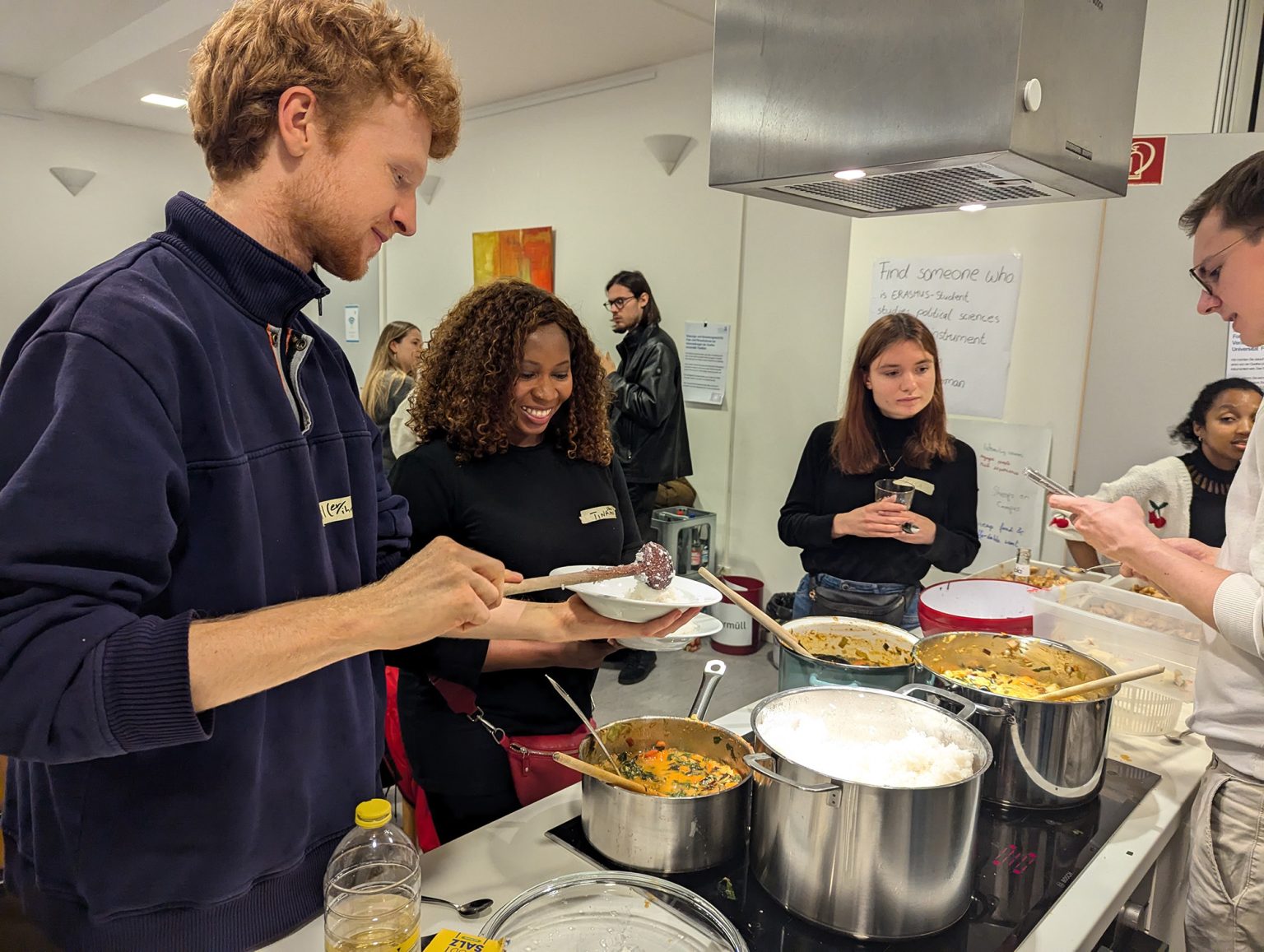 Eine Idee, wie die Internationalisierung an der Universität gelebt (und gleich auch mit Nachhaltigkeit verbunden werden kann), wurde bereits im Oktober verwirklicht: Treffpunkt von „Goethe’s Sustainable Kitchen“ für rund 40 internationale und deutsche Studierende war die Küche der Katholischen Hochschulgemeinde. Ihr Projekt: Gemeinsam nachhaltig und vegan aus saisonalen und regionalen Zutaten zu kochen. Nachhaltig waren nicht nur die vielen Rezepte, sondern auch der vielsprachige Austausch und die neuen Kontakte.