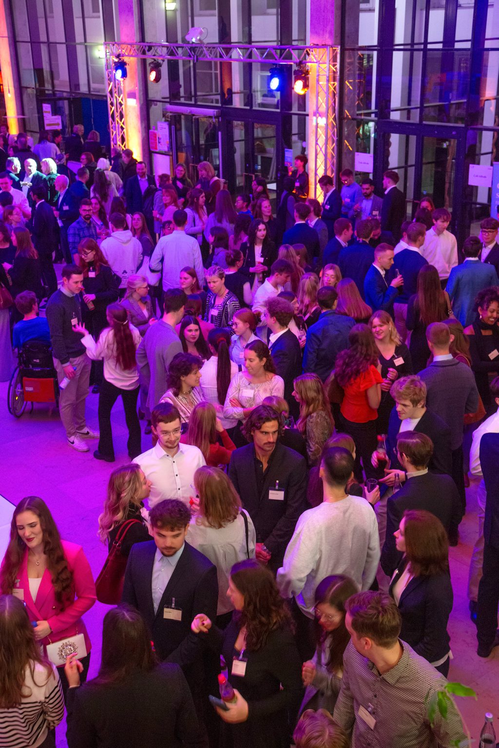 Den Auftakt auf der Bühne bildete eine Podiumsdiskussion zum Thema (Bildungs-) Gerechtigkeit unter Beteiligung des DIPF | Leibniz-Instituts für Bildungsforschung und Bildungsinformation. Dabei ging es um den Zusammenhang zwischen Bildungschancen und sozialer Herkunft, um soziale Mobilität und die Bedeutung von Politik und Forschung in Entscheidungsprozessen. Später folgten ein großes KI-Quiz in Form eines Prompt Battles sowie Talk und Comedyeinlagen der beiden schrägen „Professoren“ Dr. KNOW und Dr. HOW. Den Abschluss bildete eine Rap-Performance von Coodiny alias Nikita Kudakov und seiner Live-Band. Nikita Kudakov macht seit seiner Jugend Musik und erforscht mittlerweile als Doktorand am Max-Planck-Institut für empirische Ästhetik die Interaktion von Rappern mit dem Publikum.