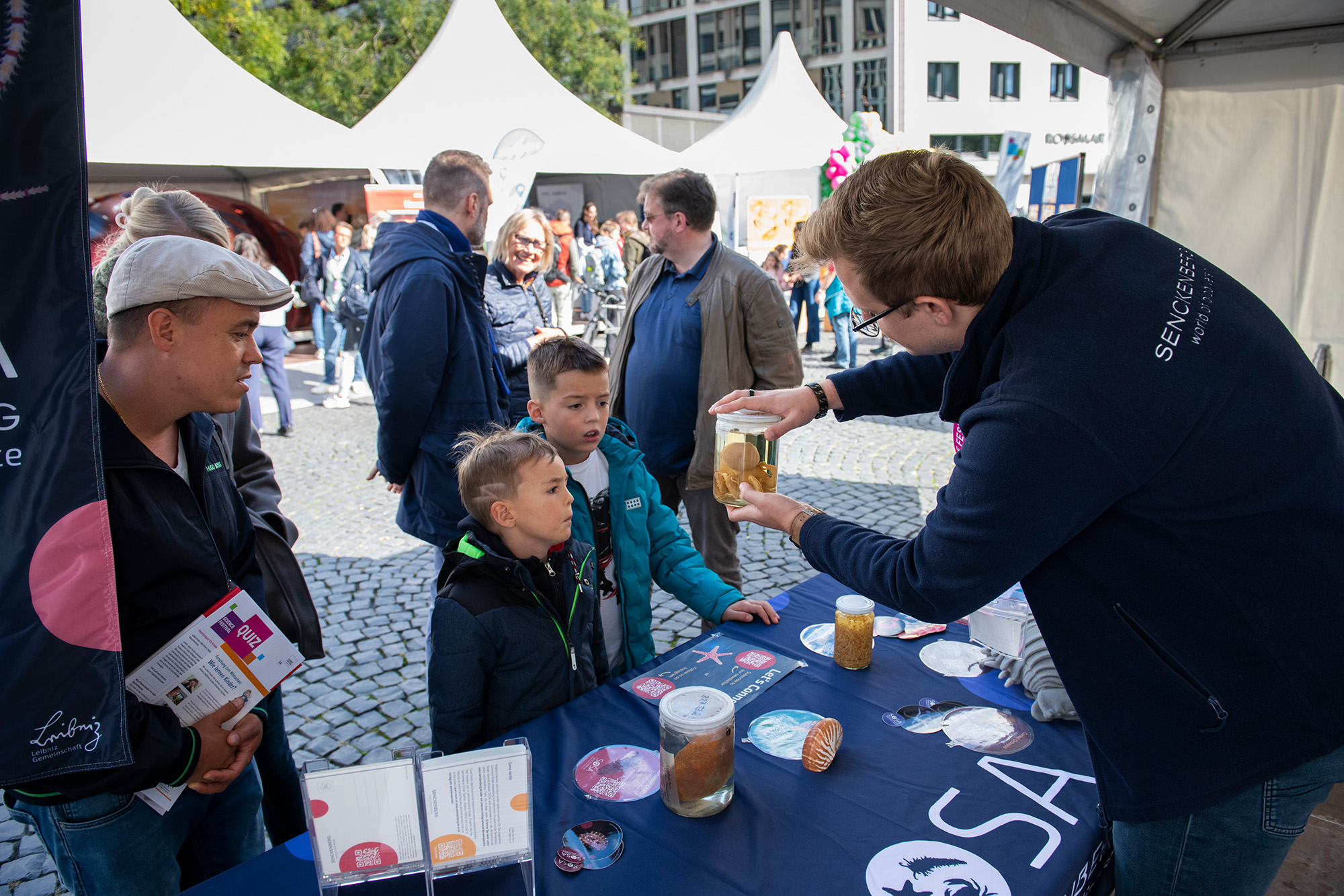 Anhand eines begehbaren Modells des menschlichen Herzens zeigten etwa Max-Planck-Institut für Herz- und Lungenforschung und Goethe-Universität gemeinsam ein zentrales Forschungsobjekt des Exzellenzclusters „Cardiopulmonary Institute“ (CPI), das den Erkrankungen des Herz-Kreislaufsystems gewidmet ist. Direkt nebenan blühte es bunt: Im Zelt der Goethe-Uni gab es offene Ateliers zum Experimentieren, Malen und Knobeln, außerdem stellten Geistes-, Sozial- und Naturwissenschaftlerinnen und -wissenschaftler in der Reihe „Herzstück meiner Forschung“ ihr ganz persönliches Lieblingsthema vor. Im Zelt der Senckenberg Gesellschaft für Naturforschung konnte man auf einer Reise um die Welt Kamerafallen aus Bolivien und Südafrika auswerten. Das Leibniz-Institut für Friedens- und Konfliktforschung sammelte Frankfurter Ideen für den Frieden. Unter dem Titel „Tauche ein in die Zelle“ hielt das Max-Planck-Institut für Biophysik VR-Brillen bereit, mit denen man die Bausteine des Lebens von innen erleben kann. Und zwei Mitmach-Experimente des GSI Helmholtzzentrums für Schwerionenforschung zeigten die Funktion von Teilchenbeschleunigern.