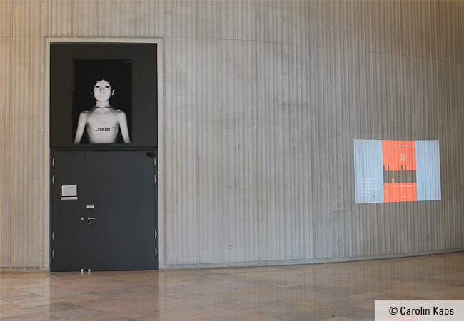 Die im großen Hörsaal A des SKW-Gebäudes versammelten Zuhörer folgten gespannt den Ausführungen des Gastredners. Das Leitmotiv des Archivierens, das generell auf viel Zuspruch traf, fand sein Echo in weiteren Beiträgen. Die Vortragenden bezogen sich, wie Abe, sowohl auf praktische Aspekte, d.h. auf technische Dimensionen und zeitgemäße Archivierungsstandards, als auch auf Vermittlung lebendigen Wissens. Nicht zuletzt präsentierte die Konferenz im Zeichen des sich im August 2025 zum 80. Mal jährenden zeitgeschichtlichen Ereignisses „Hiroshima“ eine Kunstinstallation im Foyer des SKW-Gebäudes. Die Installation stammte von Stefan Soltek, Emeritus des Klingspor Museums Offenbach. Ihm hatte der Grafikdesigner Uwe Loesch ein Originalplakat mit dem ikonischen Fotomotiv des „Little boy “ (1994) für die Zeit des Japanologentags überlassen. Soltek erläuterte den Gästen des Eröffnungsabends in einem kürzeren Kommentar die Implikationen des Werks, das einen kleinen, verloren wirkenden Jungen in Brustansicht vor schwarzem Hintergrund zeigt, um dann allgemein die Visualisierung der Atombombe in der grafischen Kunst anzusprechen.