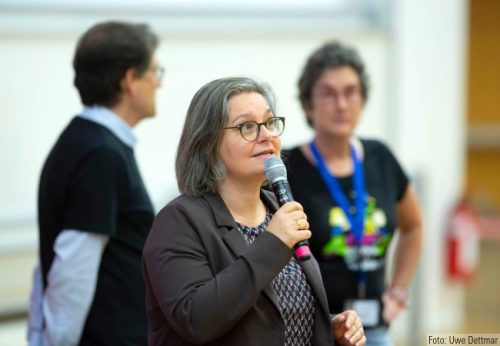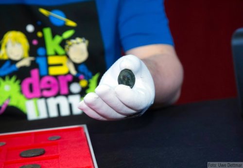 Etwas weniger weit, aber immer noch ziemlich weit in die Vergangenheit entführte Münzforscherin und Archäologin Prof. Fleur Kemmers das junge Publikum in der Vorlesung „Der Kaiser in der Spardose“. Münzen aus der römischen Antike sind für uns Heutige ungeheuer lehrreich, konnte man da lernen. Denn das System römischer Münzen mit abgestuftem Wert, die entsprechend aus Gold, Bronze oder Kupfer hergestellt wurden, blieb zwar über Jahrhundert weitgehend gleich; die darauf vermittelte Botschaft jedoch wandelte sich von Kaiser zu Kaiser, von Jahr zu Jahr. Der jeweilige Herrscher nutzte die Werbefläche, um sich mit all seinen Vorzügen und Errungenschaften darzustellen und so beim Volk im Gedächtnis zu bleiben. Dass das wirklich funktioniert hat, das konnte die Professorin eindrucksvoll zeigen. Und in der Fragerunde am Ende zeigte sich: Es saßen einige Expertinnen und Experten für die Antike und für Latein im Publikum.