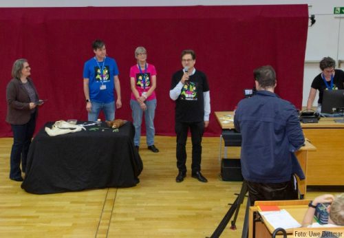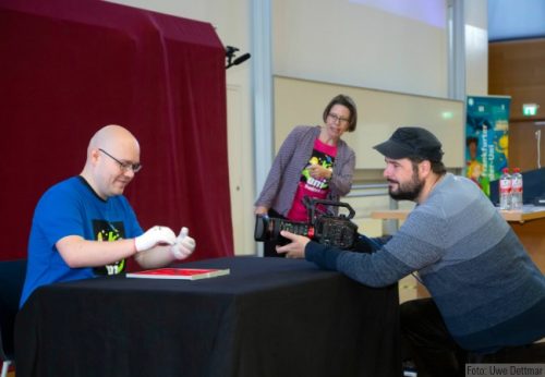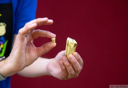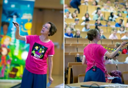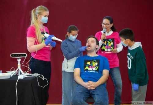 Selbst Hand anlegen und buchstäblich kräftig mitmischen konnten die Kinder-Uni-Studis am dritten Tag in der Vorlesung „Wie macht man einen neuen Zahn“ von Dr. Steffani Görl, Dr. Kathrin Seidel und Sebastian Heuser, allesamt Zahnmediziner: Da ging es um Zahnersatz bei großen Leuten, wo die Zähne ja nicht mehr nachwachsen wie beim Hai. Um einen künstlichen Zahn herzustellen, braucht es einen Abguss vom Gebiss. Der wurde bisher immer mit Hilfe einer weichen Masse hergestellt. Was einige im Auditorium schon vom Kieferorthopäden kannten, und die meisten von ihnen ziemlich eklig finden (manche auch nicht, nämlich wenn man sich zwischen Kirsch- und Colageschmack entscheiden kann). Da ist es doch eine gute Nachricht, dass es auch anders geht, nämlich mit einem Intraoral-Scanner, der das Gebiss digital erfasst. Das Anrühren der Abdruckmasse hat aber offenbar genauso viel Spaß gemacht wie das Hantieren mit der Spezialkamera.
