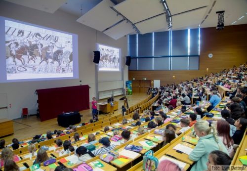 Mit einer Vorlesung über den Teppich von Bayeux und die Eroberung Englands durch die Normannen ist die 22. Frankfurter Kinder-Uni-Woche zu Ende gegangen. Die acht Vormittagsveranstaltungen fanden jeweils vor rund 1200 Schülerinnen und Schülern und deren Lehrkräften statt, insgesamt waren wieder an die 10.000 Kinder auf dem Campus unterwegs. Wochen vorher bereits waren die Veranstaltungen für Schulklassen ausgebucht, Absagen gab es diesmal nur wenige. Am Nachmittag kamen wieder Kinder mit Eltern, Großeltern oder anderen erwachsenen Begleitpersonen, um sich mit den spannenden Themen zu beschäftigen. Videoaufzeichnungen der Vorlesungen können hier noch einmal angesehen werden:
