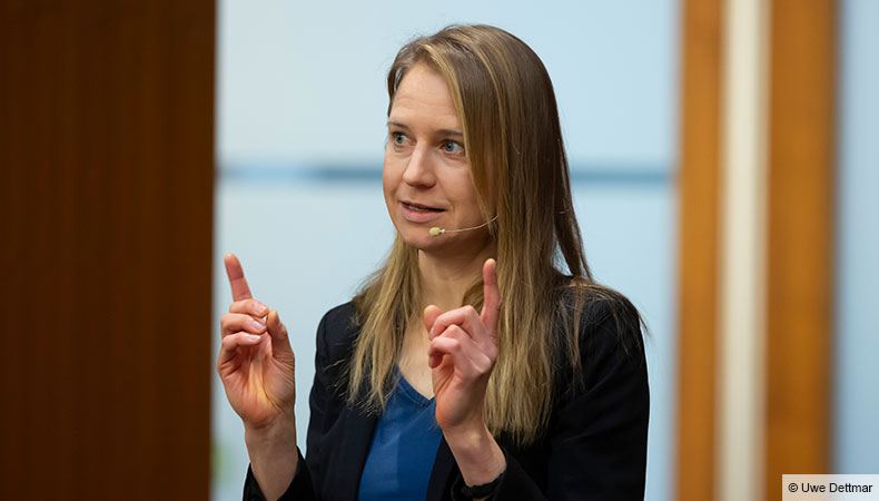 Prof. Dr. Maren Urner, Neurowissenschaftlerin der FH Münster, warf mit ihrer Keynote „Transformation braucht Emotion“ eine weitere wichtige Frage auf: Wie sollte Wissenschaft kommunizieren, damit sie nachhaltig wirkt? „Nachhaltige Transformation an der Goethe-Universität gelingt, wenn wir Menschen emotional erreichen und vor allem neue Geschichten über Erfolg erzählen“, erklärte sie.