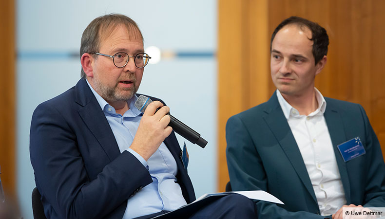 Zu Beginn der Veranstaltung sprachen Präsident Schleiff und der neu berufene Prof. Dr. Nico Wunderling vom Center for Critical Computational Studies (C3S) über die wichtige Rolle der Wissenschaft für die sozial-ökologische Transformation. Wunderling berichtete von seinem Besuch der Klimakonferenz COP30 in Belém und betonte: „Damit nachhaltige Transformation gelingt brauchen wir neue Ansätze, um Forschung gemeinsam zu denken und sie zu kommunizieren, gerade im Bereich der Nachhaltigkeit.“ Präsident Schleiff ergänzte: „Universitäten sind für nachhaltige Transformation wichtig, weil sie Wissen erarbeiten, dieses Wissen gemeinsam mit der Gesellschaft in Lösungen übersetzen können und damit auch politisches Handeln motivieren.“